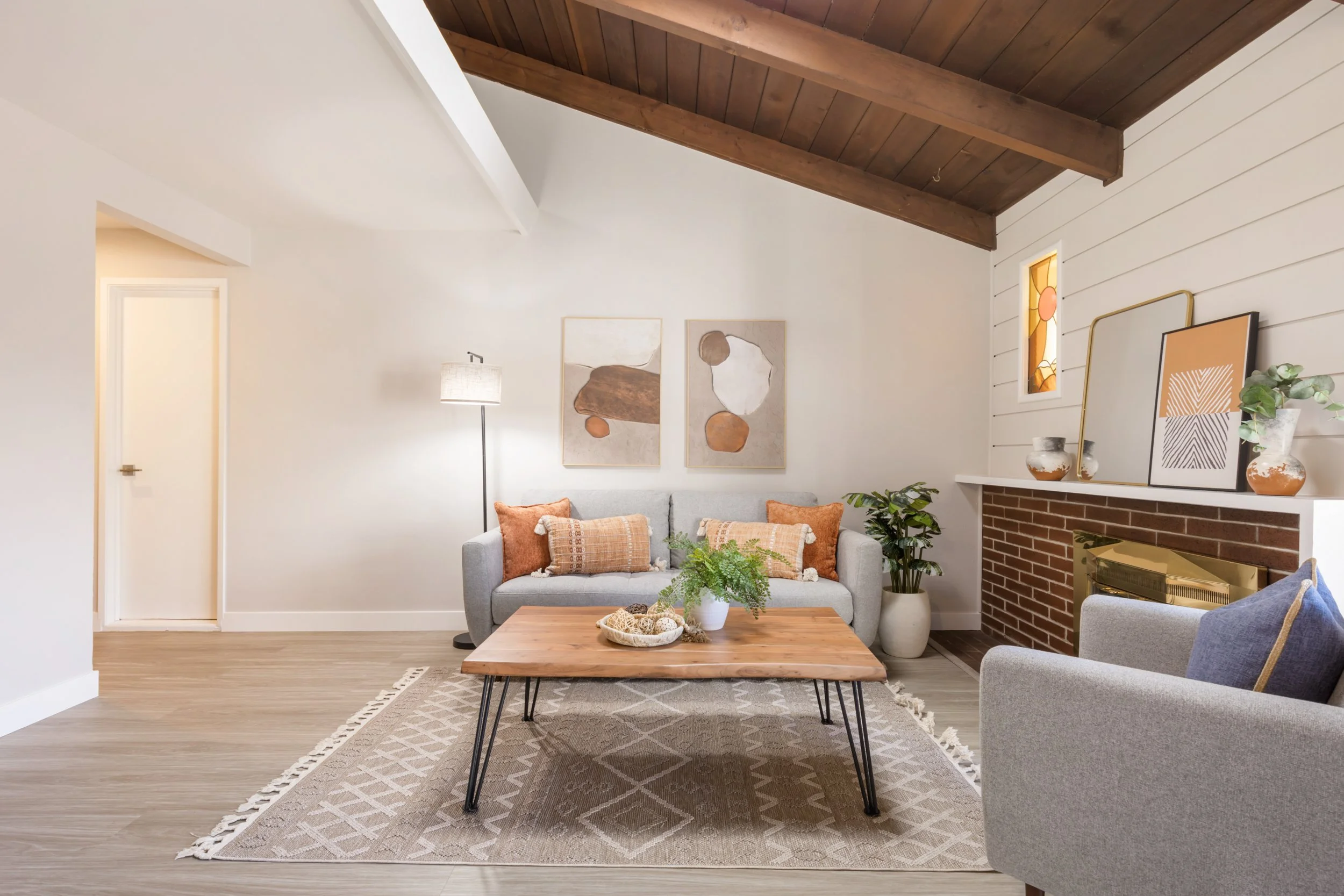 Experience the charm of a newly refreshed home with freshly painted interiors and exteriors. Most of the home features luxury vinyl tile flooring, creating a seamless flow throughout. The open living room boasts a vaulted wood beam ceiling, a skylight, and floor-to-ceiling windows that flood the space with natural light. A wood-burning fireplace adds warmth and coziness.